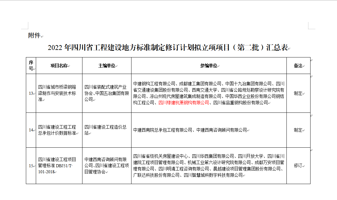 “行業(yè)標準為旗桿,科研技術(shù)為導(dǎo)向”,2022年8月22日,四川綠建杭蕭鋼構(gòu)有限公司(以下簡稱:綠建杭蕭)參編的《四川省城市橋梁鋼箱梁制作與安裝技術(shù)標準》在四川省住建廳官網(wǎng)進行公示。這是繼“中國鋼結(jié)構(gòu)協(xié)會”會員單位、第二批天府綜改企業(yè)之后,同年再次獲得的殊榮。綠建杭蕭在行業(yè)領(lǐng)域標準中發(fā)出了自己的聲音!